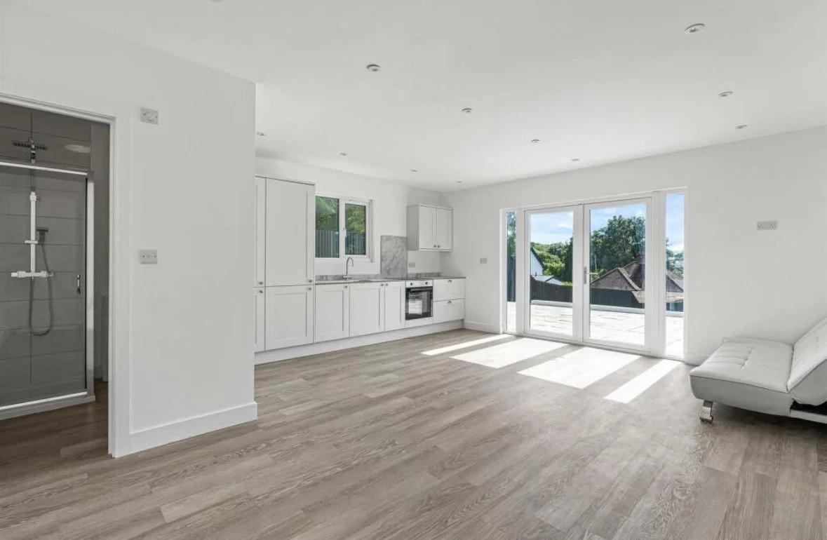 This bespoke garden room has been transformed into a multifunctional space, featuring a fully equipped home gym, a stylish contained bedroom with walk-in wardrobe, and a luxurious en-suite bathroom.