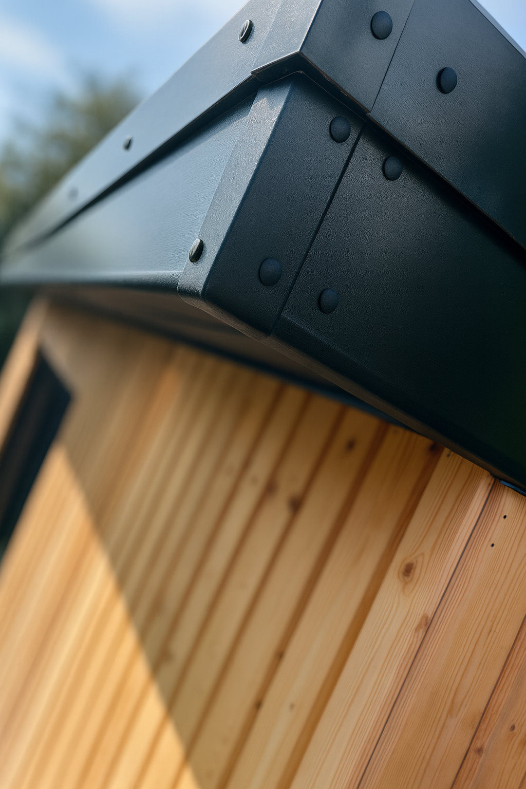 This compact garden room is finished with composite cladding, anthracite aluminium French doors, and a bright, modern interior, making it a perfect space-saving solution when outdoor room is limited.